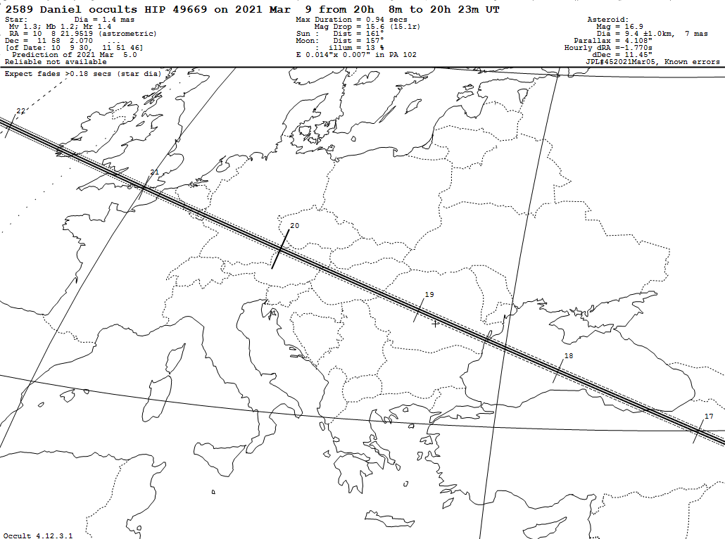 Figure 1. The predicted path for Europe of the occultation of Regulus by (2589) Daniel made with data from JPL Horizons. Predicted by Steve Preston, IOTA, on 2021 March 05. Graphic made with Dave Herald’s Occult V4.