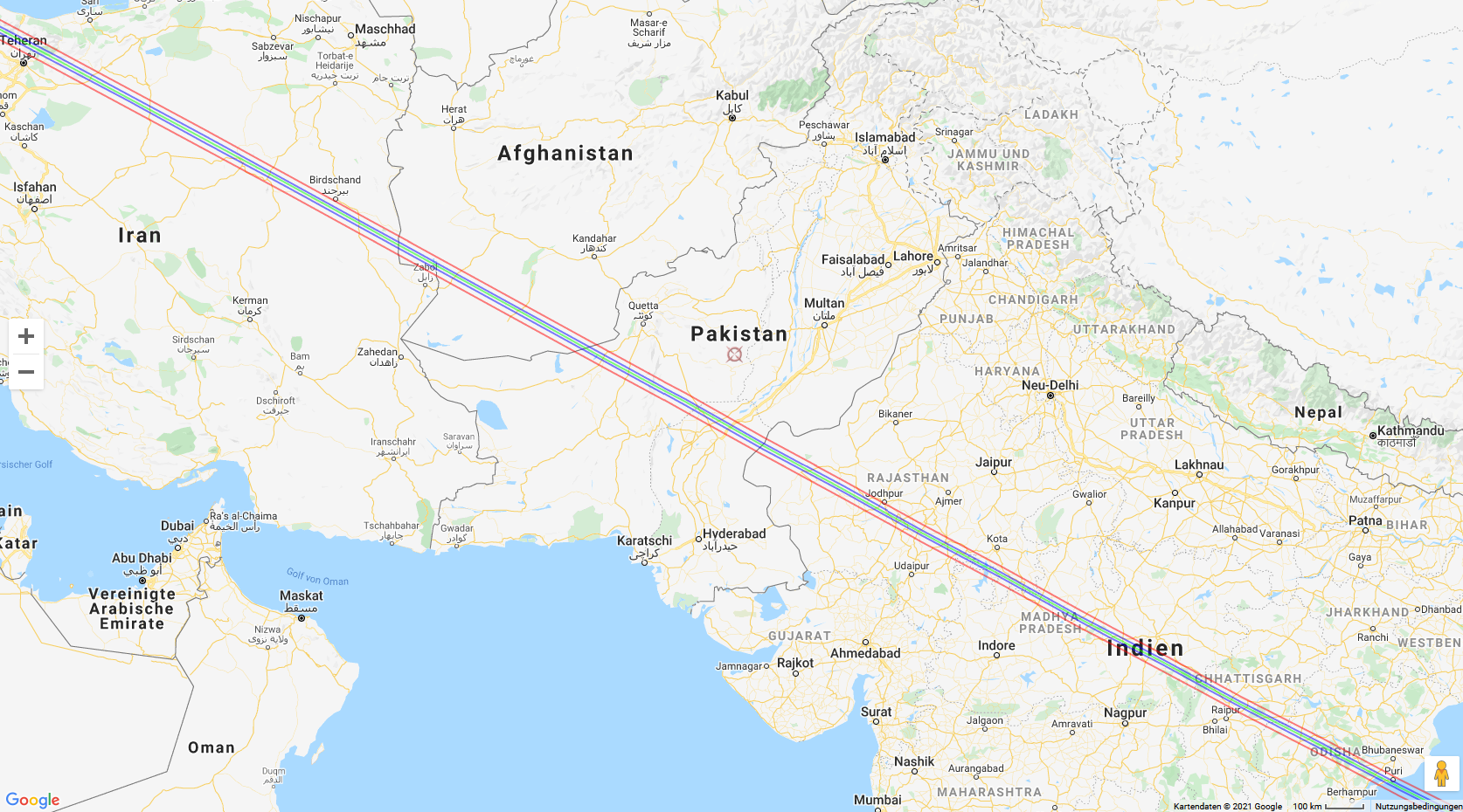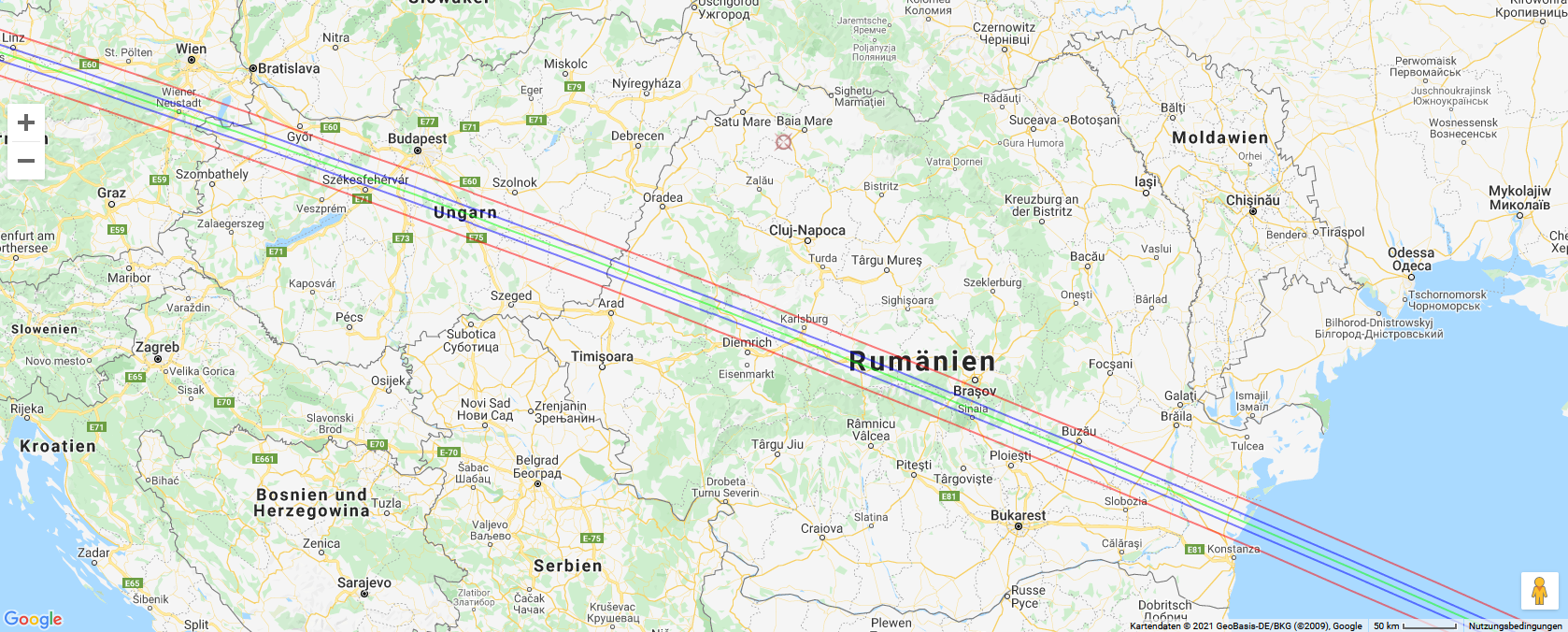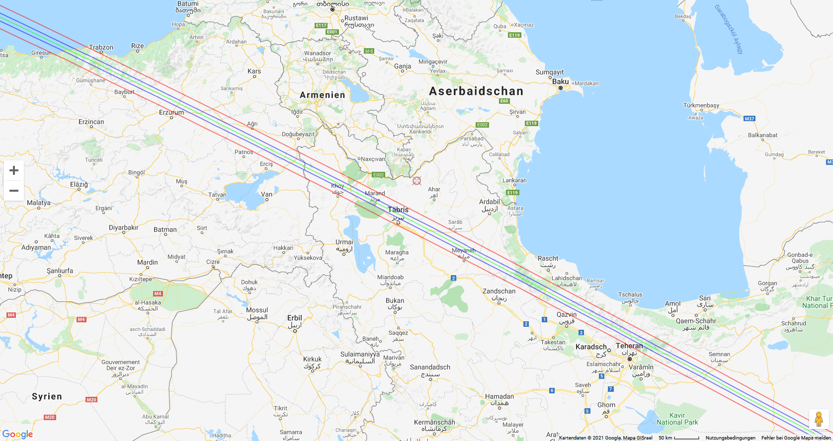 Figures 2-7. The occultation will occur between the two red lines with a probability of 68 %. (Map data: 2021 Google, INEGI, (c) 2021 GeoBasis-DE/BKG ((c) 2009), Google, Inst. Geogr. National)