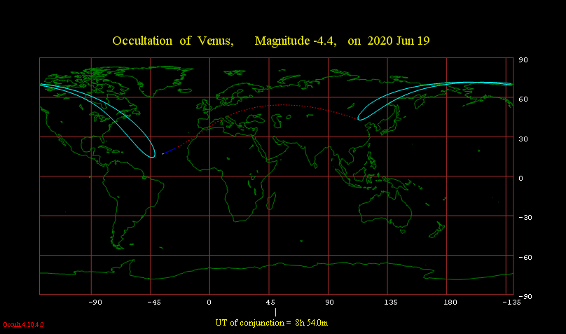 In the morning hours of the 19th of June 2020 the Moon will occult Venus. It can be seen in large parts of central Europe and other regions of the world as can be seen in the following graphic. The red dotted line on the map is the southern limit of the occultation. South of this line the occultation can not be seen.